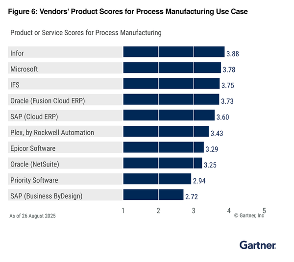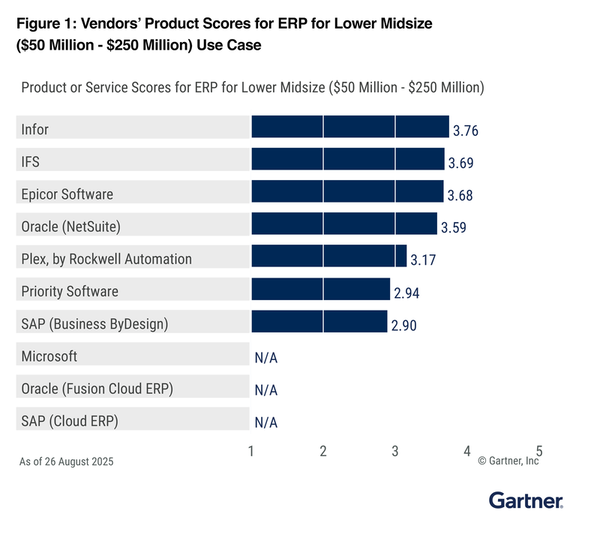 Gartner Cloud ERP for Product-Centric EnterprisesKaynak: Gartner, Critical Capabilities for Cloud ERP for Product-Centric Enterprises, Tomas Kienast, Johan Jartelius, Greg Leiter, Denis Torii, Robert Anderson, Dennis Gaughan, 14 Ekim 2025.